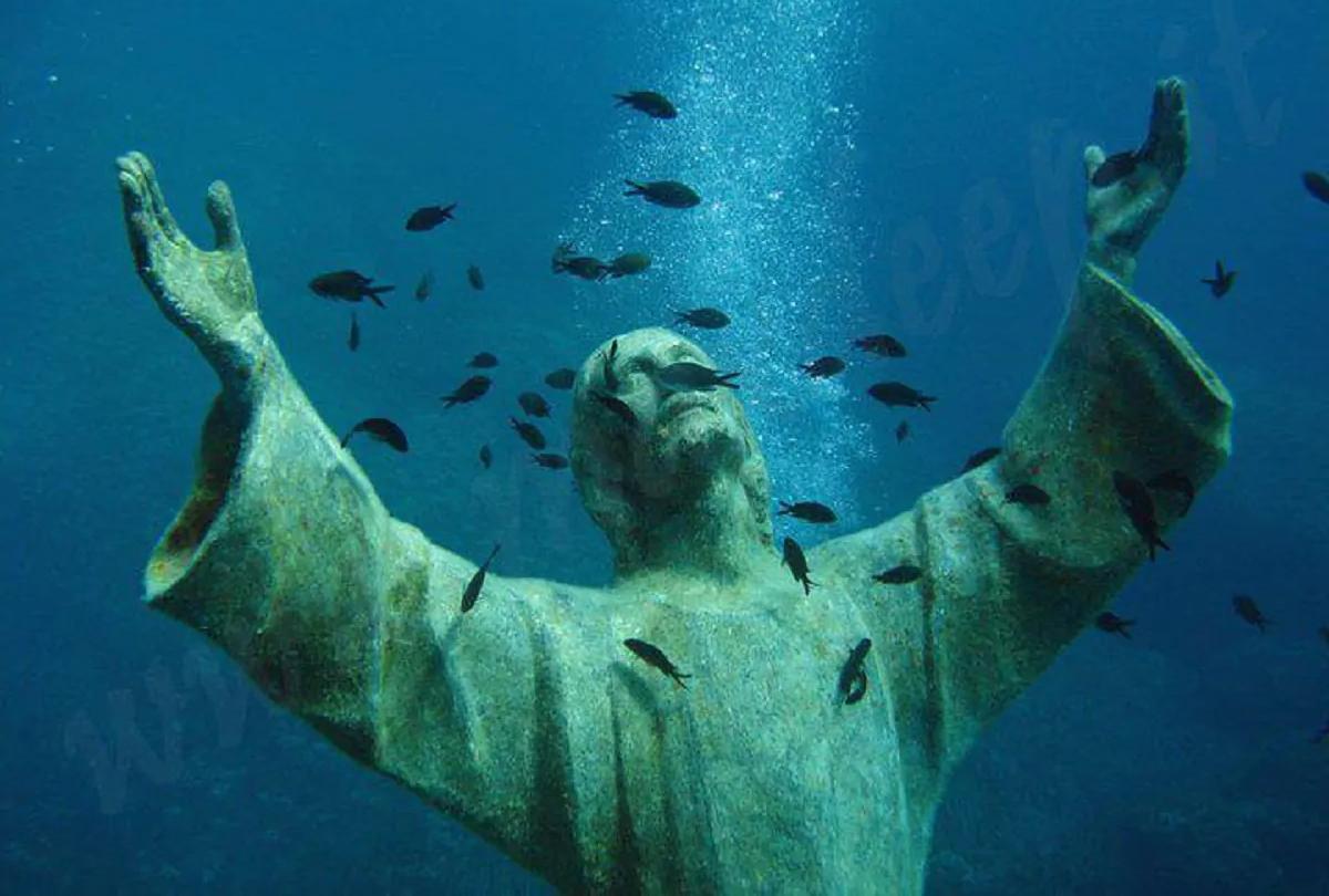 On clear days, Cristo degli Abissi, a 2-1/2 meter underwater bronze statue of Christ with open arms, gazing up at the surface, can be seen standing on the bottom of the Bay of San Fruttuoso. The statue is a magnet for divers, who often celebrate weddings almost within the embrace of the statue.